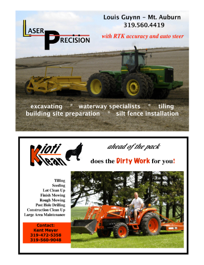 Laser Precision, LLC provides excavating, tiling and waterway services in Iowa. We are located outside Mt Auburn, near Vinton, IA and are happy to schedule a visit to assess your unique or run of the mill farm services request. Please give us a call and ask for Louie.